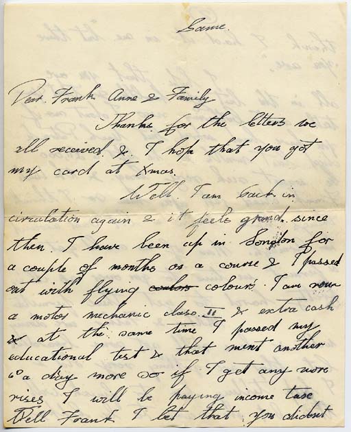 Well I am back in circulation again & it feels grand.  Since then I have been up in London for a couple of months on a course & I passed it with flying colours. I am now a motor mechanic class II & extra cash & at the same time I passed my educational test & that ment another 60 a day more so if I get any more rises I will be paying income tax.  Well Frank I bet that you didn’t