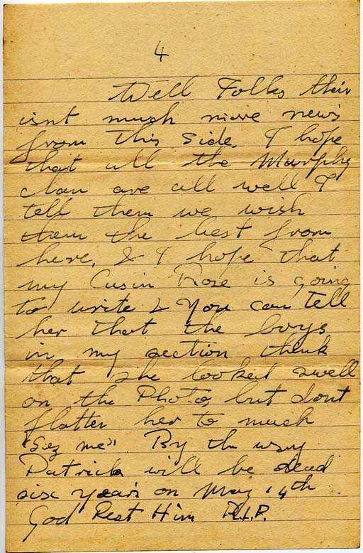 Well Folks their isn’t much more news from this side.  I hope that all the Murphy clan are all well & tell them we wish them the best from here, & I hope that my Cusin Rose is going to write & you can tell her that the boys in my section think that she looked swell on the Photo but don’t flatter her to much “sez me”  By the way Patrick will be dead six year’s on May 14th